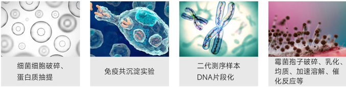 通過(guò)壓電轉(zhuǎn)換器,將電信號(hào)轉(zhuǎn)變?yōu)楦哳l聲波信號(hào),產(chǎn)生數(shù)百萬(wàn)的分子“空穴”,利用“空穴”在幾秒內(nèi)變大、破裂產(chǎn)生的瞬時(shí)流體剪切力,通過(guò)等溫、非接觸的方式對(duì)樣本進(jìn)行打斷、勻漿和混合。