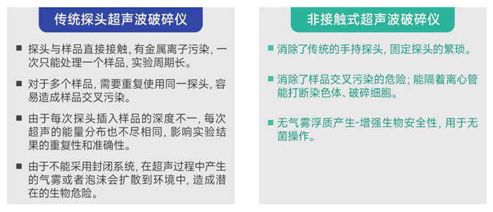 非接觸式樣品可在密閉容器下進(jìn)行破碎,不產(chǎn)生感染性飛霧,超聲探頭與樣品不接觸,避免交叉污染。對(duì)于每天要處理多個(gè)樣品或者貴重樣品的實(shí)驗(yàn)室,非接觸超聲波DNA破碎儀具有處理高通量,樣本低損耗無(wú)交叉污染等優(yōu)勢(shì)。逐漸成為ChIP(染色質(zhì)免疫共沉淀)和DNA剪切研究平臺(tái)不可缺少的標(biāo)準(zhǔn)化工具。