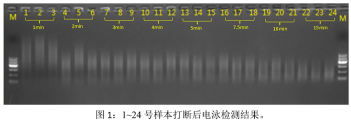 實(shí)驗(yàn)結(jié)果表明:(1) 隨著打斷時(shí)間的增加,打斷片段的大小也隨之變小;(2) 相同打斷條件下,打斷效果的重復(fù)性和均一性良好。