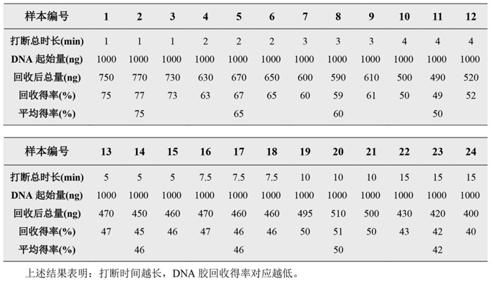 2.不同打斷時(shí)長(zhǎng)下的回收得率: