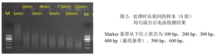 3.相同處理時(shí)長(zhǎng)的樣本混合后,瓊脂糖凝膠電泳檢測(cè)結(jié)果: