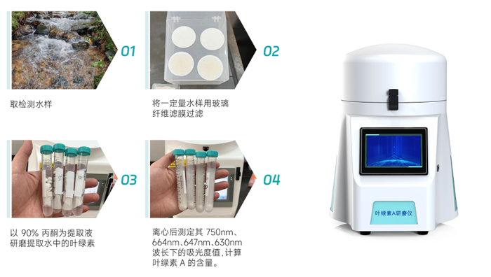 將一定量樣品用濾膜過濾截留藻類,研磨破碎藻類細(xì)胞,用丙酮溶液提取葉綠素,離心分離后分別于750nm、664nm、647nm和630nm波長(zhǎng)處測(cè)定提取液吸光度,根據(jù)公式計(jì)算水中葉綠素a的濃度。